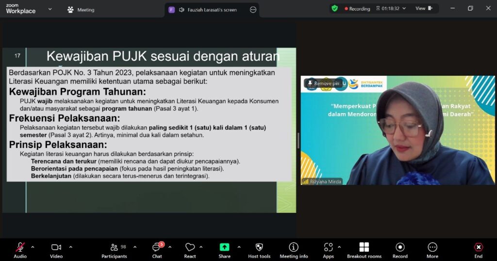 Dalam paparannya, Dr. Rizyana menjelaskan peran strategis Bank Perekonomian Rakyat (BPR) dalam mendorong pertumbuhan ekonomi daerah dan pemberdayaan UMKM, sekaligus menyoroti pentingnya transformasi digital dan tata kelola yang baik di sektor perbankan daerah. Beliau juga menekankan bahwa BPR memiliki potensi besar untuk menjadi mitra pemerintah daerah dalam membangun ekonomi masyarakat yang inklusif dan berkelanjutan.