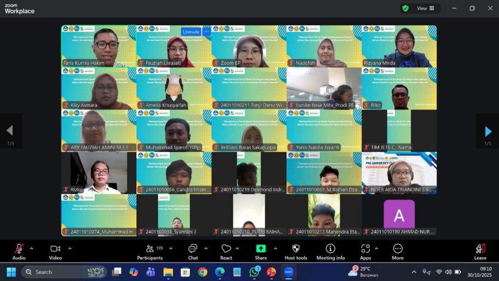 Program Studi Ekonomi Pembangunan, Fakultas Ekonomi dan Bisnis, Universitas Pembangunan Nasional Veteran Jawa Timur, telah menyelenggarakan kegiatan Kuliah Tamu bertema “Memperkuat Peran Bank Perekonomian Rakyat dalam Mendorong Pertumbuhan Ekonomi Daerah”. Kegiatan ini dilaksanakan secara daring melalui platform Zoom Meeting pada Kamis, 30 Oktober 2025, dengan menghadirkan narasumber Dr. Rizyana Mirda, S.E., M.M, Komisaris Utama PT BPR Tugu Artha Sejahtera (Perseroda).