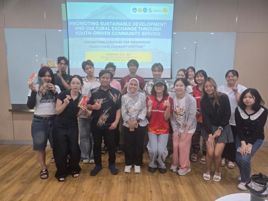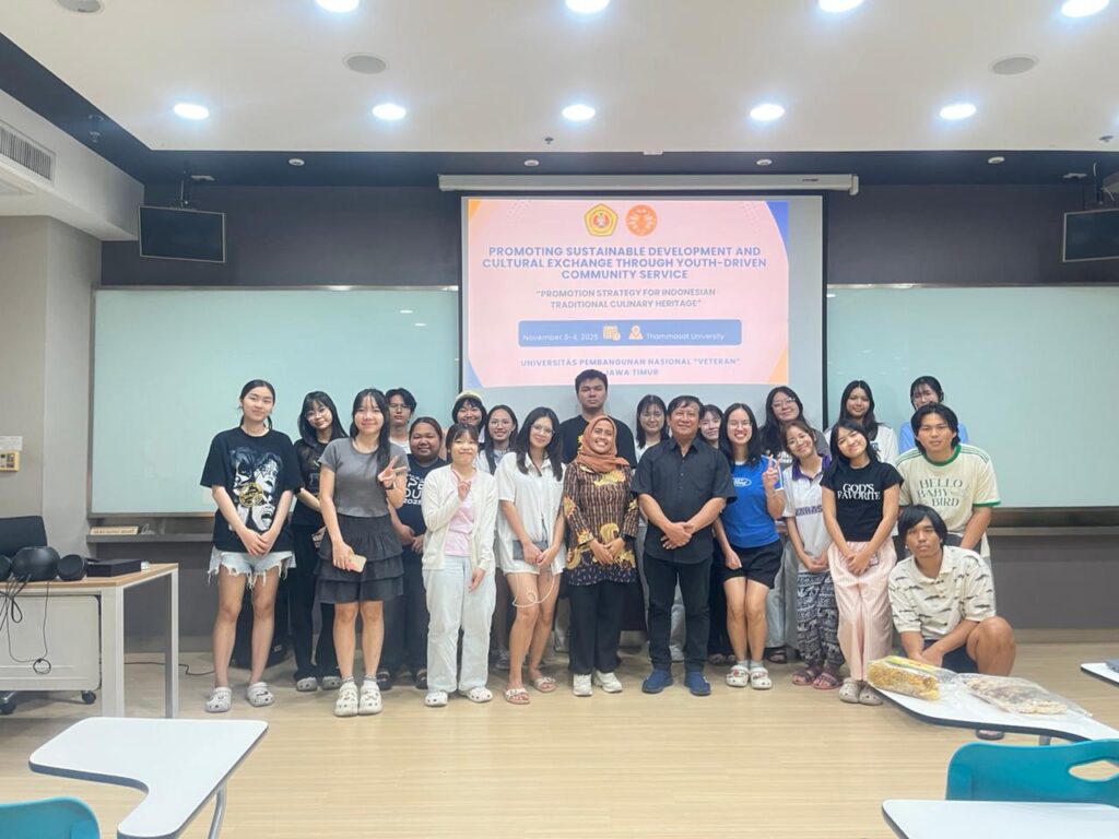 Dalam rangka memperkuat jejaring internasional dan memperluas kontribusi akademik lintas negara, Dosen Universitas Pembangunan Nasional “Veteran” Jawa Timur (UPNVJT), Nadofah, S.E., M.E., melaksanakan kegiatan pengenalan kuliner Indonesia di Thammasat University, Thailand. Kegiatan ini menjadi bagian dari agenda bertajuk “Promoting Sustainable Development and Cultural Exchange through Youth-Driven Community Service” yang mengedepankan nilai pembangunan berkelanjutan dan pertukaran budaya melalui pendidikan.